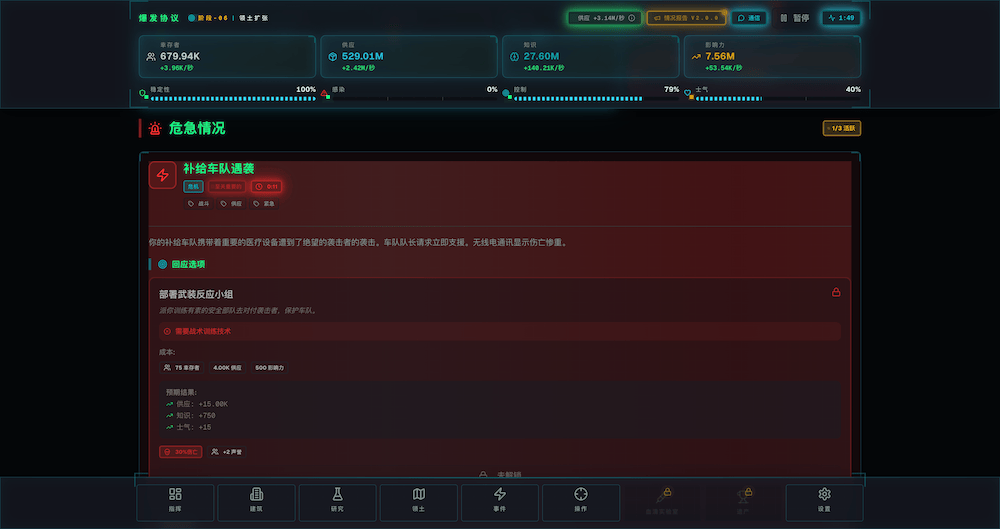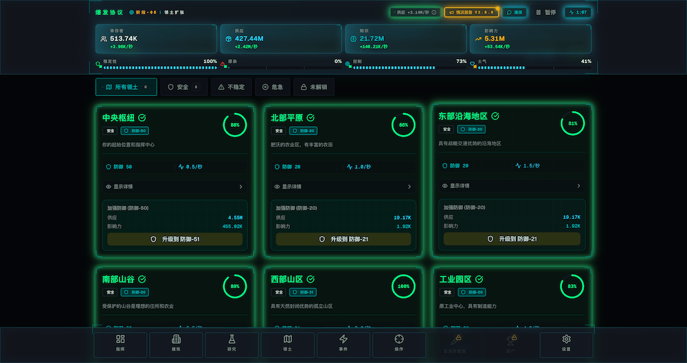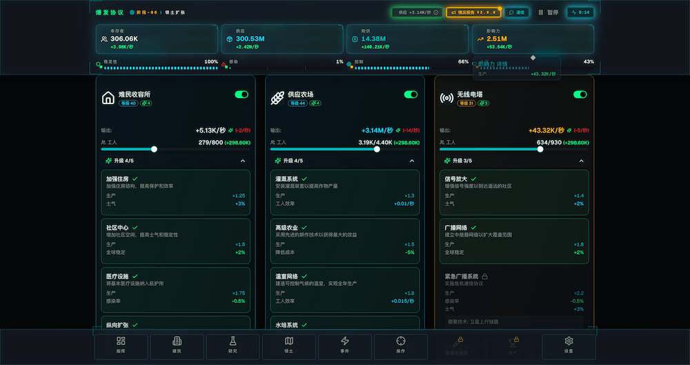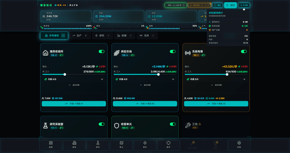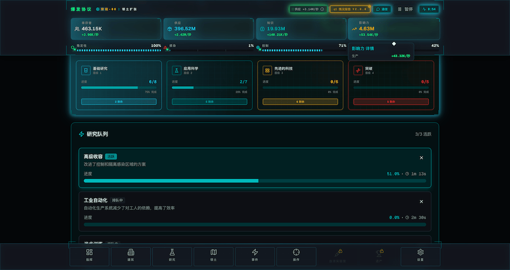 - 这可不是那种数字永远增加的点击游戏。每个决定都有代价。如果幸存者耗尽,如果感染失控,或者全球稳定崩溃,你就会输。永远输。你可以凭借声望加成重新开始,但失败总是意味着后果。