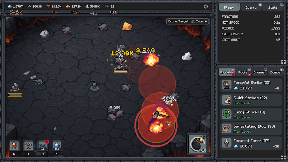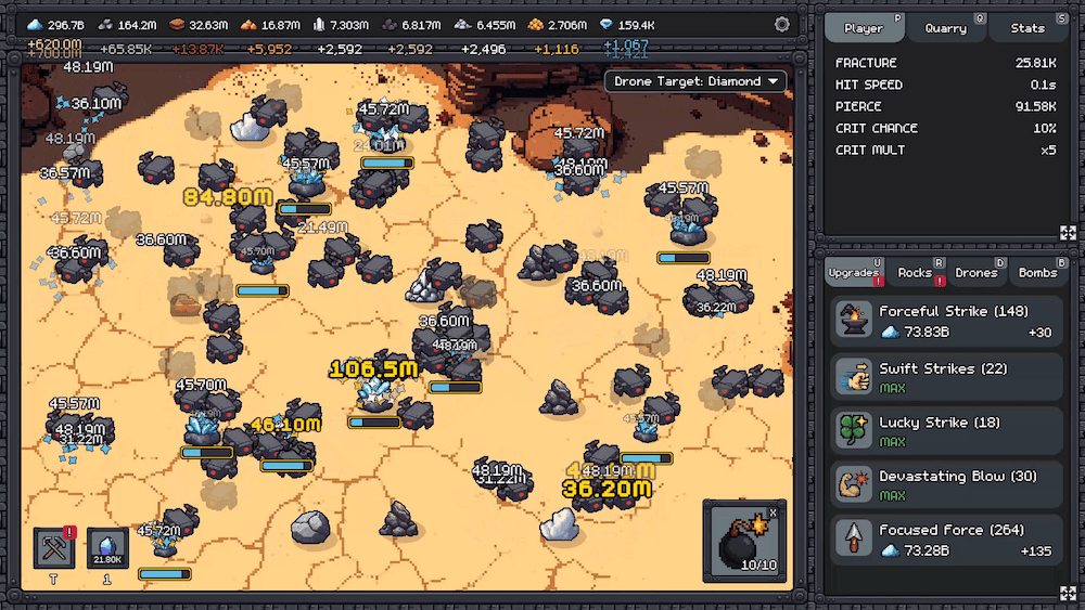 掌握挖矿那叮叮当当的节奏韵律,感受每次挖掘带来的冲击,收获矿物之中的资源。剥开岩石、陶土和砂石构建的面纱,发掘矿脉之中宝贵珍稀的金属、宝石,每一层矿层都会更加坚硬,但其中的报酬也会愈发丰厚。但是只靠蛮力可没法管好矿场,留给你的空间也非常有限。你必须动起脑子,担当起管理的责任,运用积攒的强力炸弹,巧妙地清理矿场,把采矿效率提升到最高。