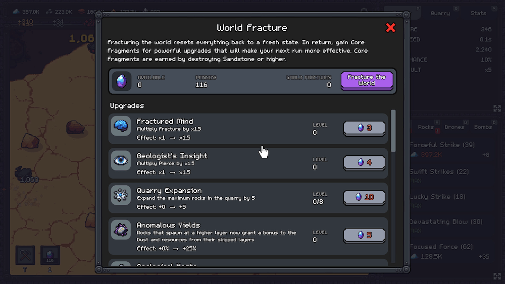 这获得足够力量之后,你便可以发动“世界大破坏”。破坏一切,收获核心碎片,这是一种强大的转生材料。用碎片去解锁足以改变游戏玩法的永久升级,彻底改变你在下一场游戏中的游玩路径。循环再次开始,但这次你已不同凡响。