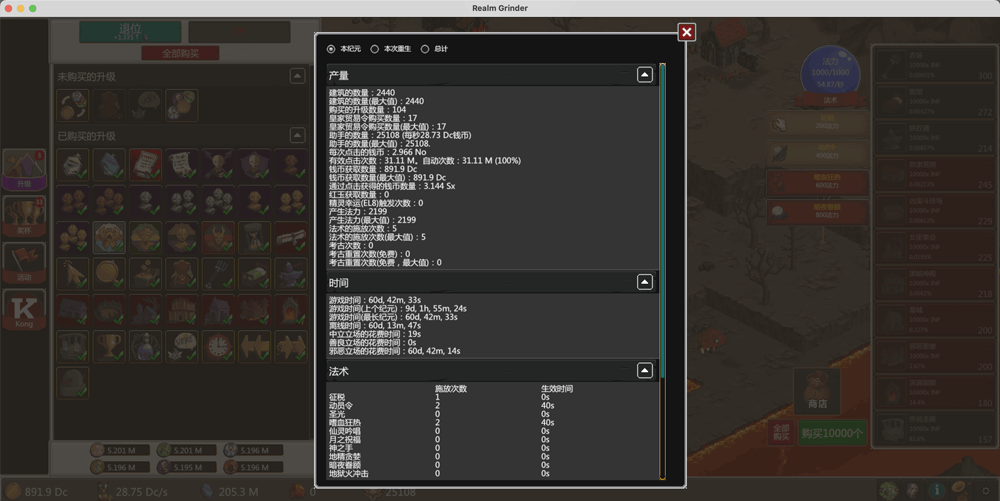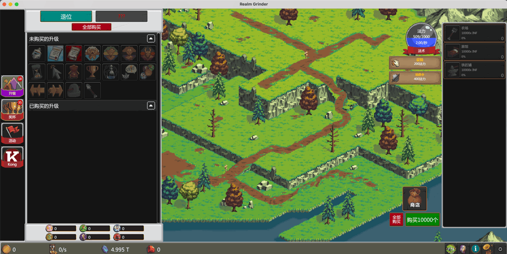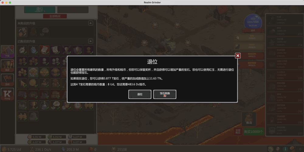 当你对自己的统治感到满意并希望重新开始冒险时,按下选项卡中的“放弃”按钮。这样做将把你所有的硬币,建筑和升级变成宝石,这将提高你的下一个会话的整体生产。所有奖杯和一些统计数据将被保存和记录在整个过程中,导致更好的奖金。