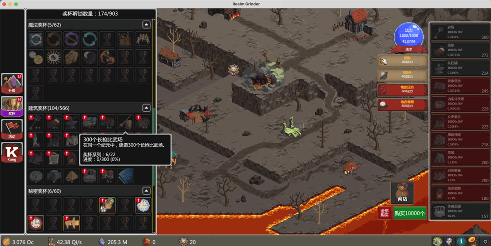 你将通过实现特定的目标来解锁新的升级和法术,比如建造一定数量的建筑,点击足够的宝物次数,施放法术或折磨游戏时间。有些需求会在会话期间保持解锁,但大多数不会。