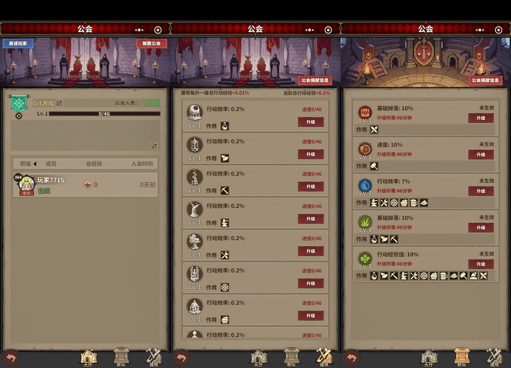 游戏可以组建工会,所有玩家可以捐献物资,提升工会的建筑或祭坛等级从而获得海量工会专属buff加成。