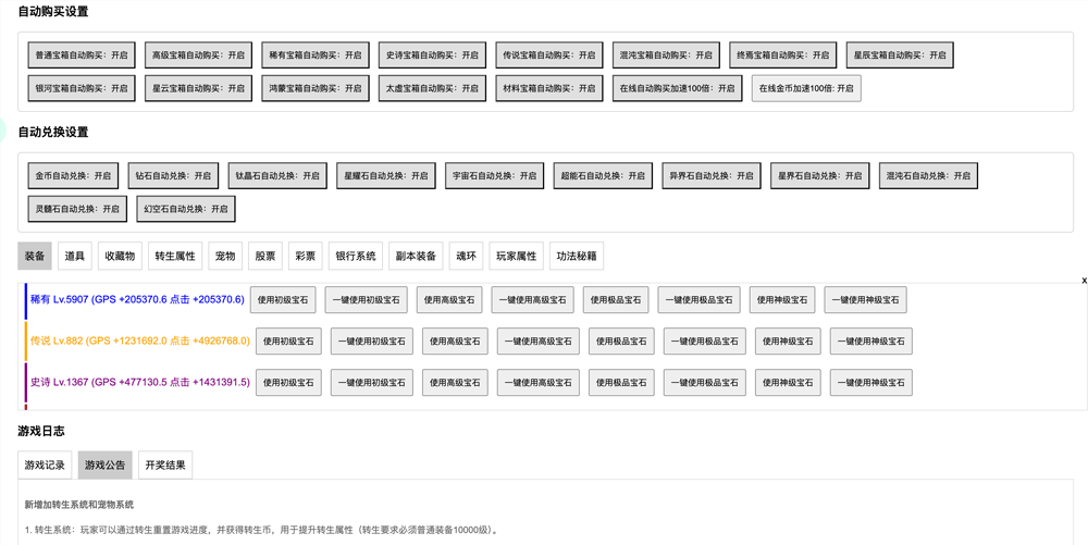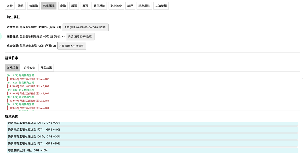1. 转生系统:玩家可以通过转生重置游戏进度,并获得转生币,用于提升转生属性(转生要求必须普通装备10000+转生次数*20)。