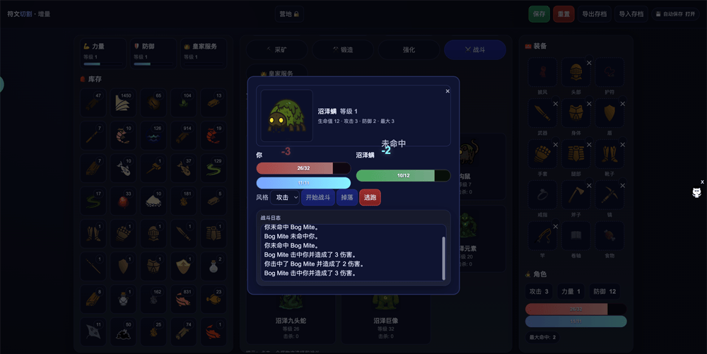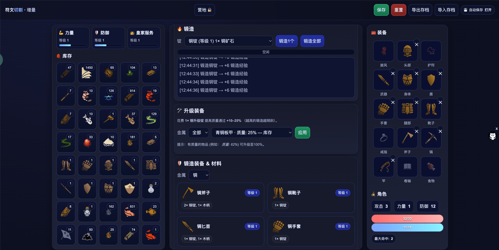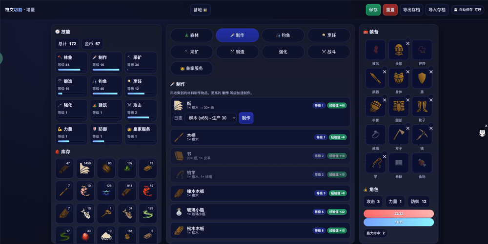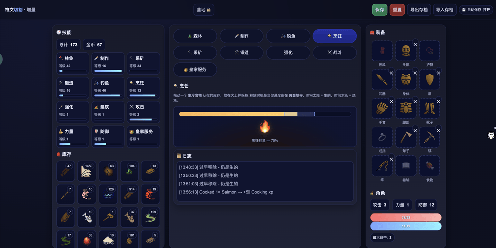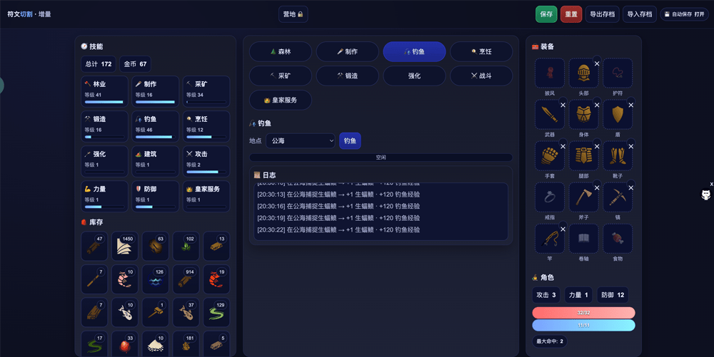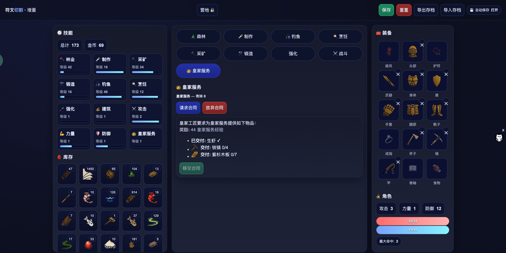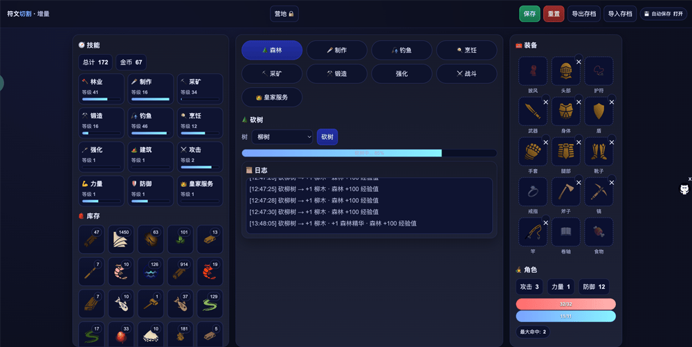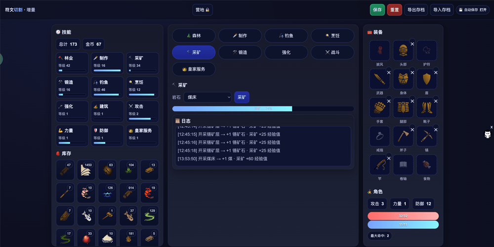 《符文切割放置》是一款基于浏览器的RPG游戏,将经典技能与渐进式进程结合在一起。你将在多个区域砍树、挖矿、抓鱼、打怪物——升级你的属性、锻造新装备,并在你前进的过程中追逐成就。