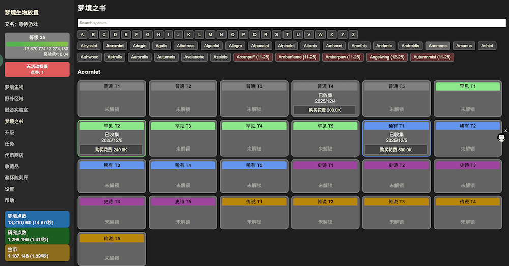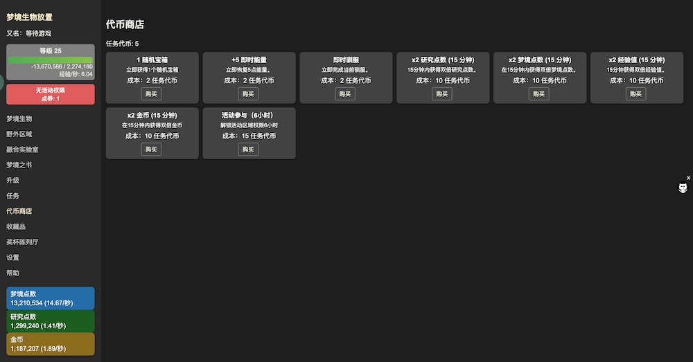 欢迎来到《梦境生物闲置》(Dreamlings Idle),这是一款基于文字的生物收集游戏,虽然存在一些bug,但游戏的核心玩法就是等待。游戏的大部分内容(但并非全部)是在多个AI的协助下完成的。正因如此,由于开发者并非真正的开发者,而只是一个有囤积癖的人,所以游戏很可能存在不少bug。此外,游戏中没有图片,但有一些表情符号。