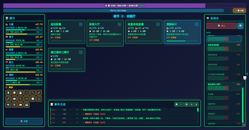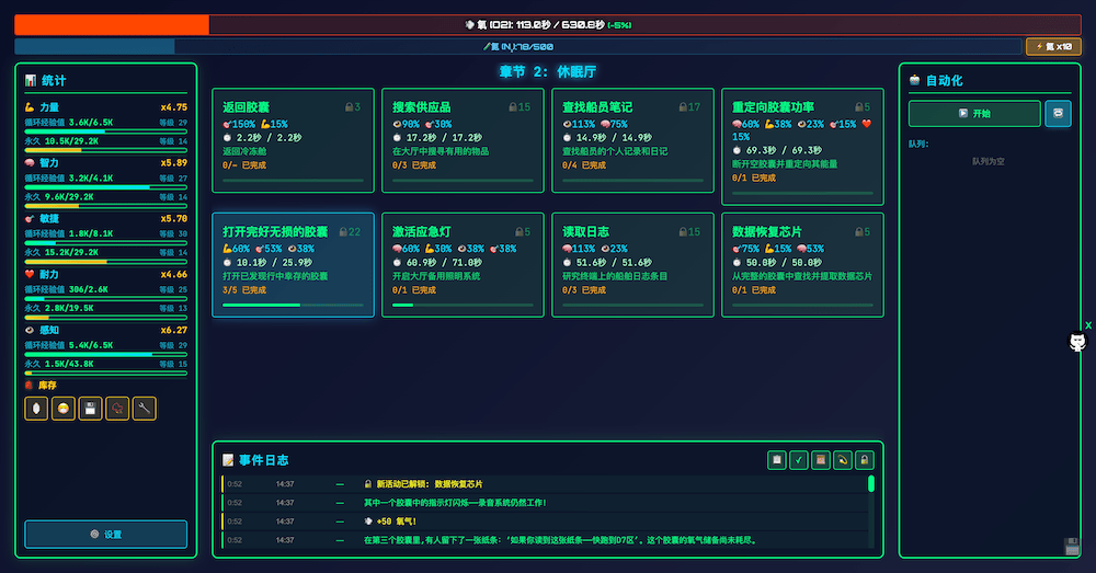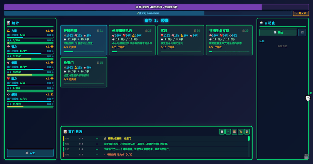 - 循环系统:每次循环中你的氧气供应有限。完成各项活动以获得属性值并解锁新的属性。