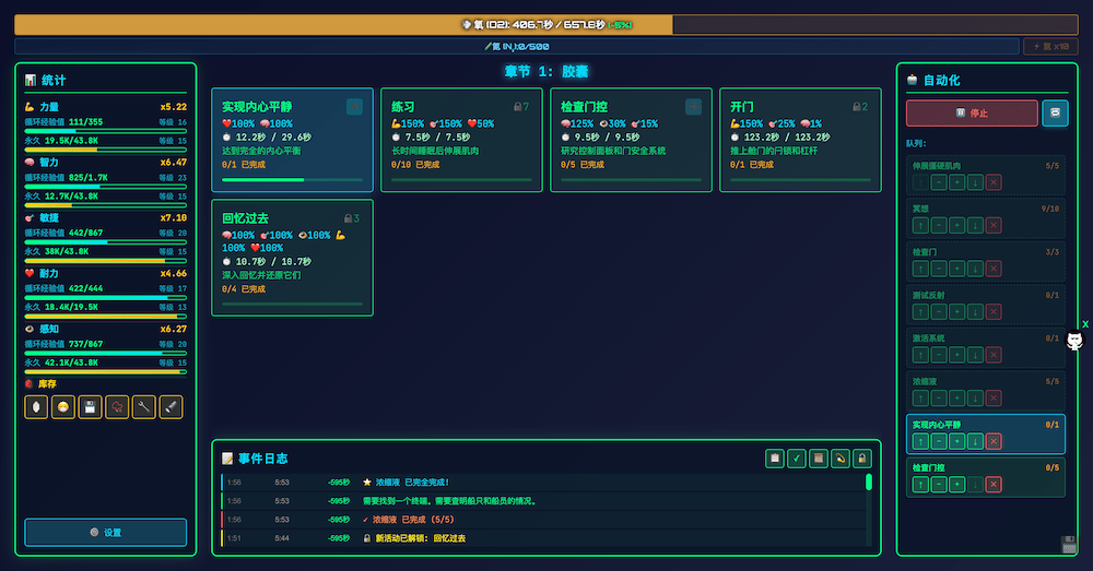 游戏玩法类似于《循环放置》、《Increlution》等游戏。等任务右上角数字变成0,会变成加号,可以添加到队列自动执行。