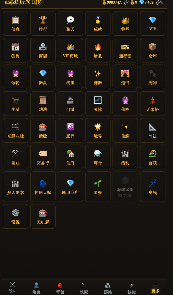 新手村出发,历经仙界、神界、混沌、圣界、虚无、大道、仙人域、金仙域、大罗天、圣人域,最终抵达天道域。13个篇章,转生解锁新地图,越往后挑战越大,收获也越丰厚。