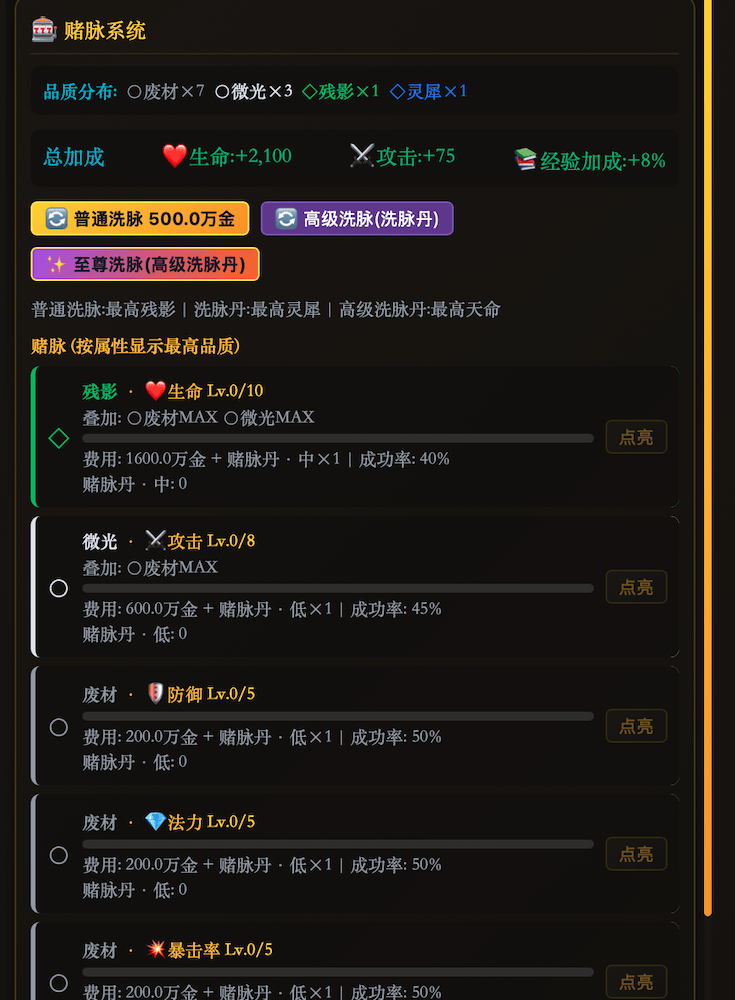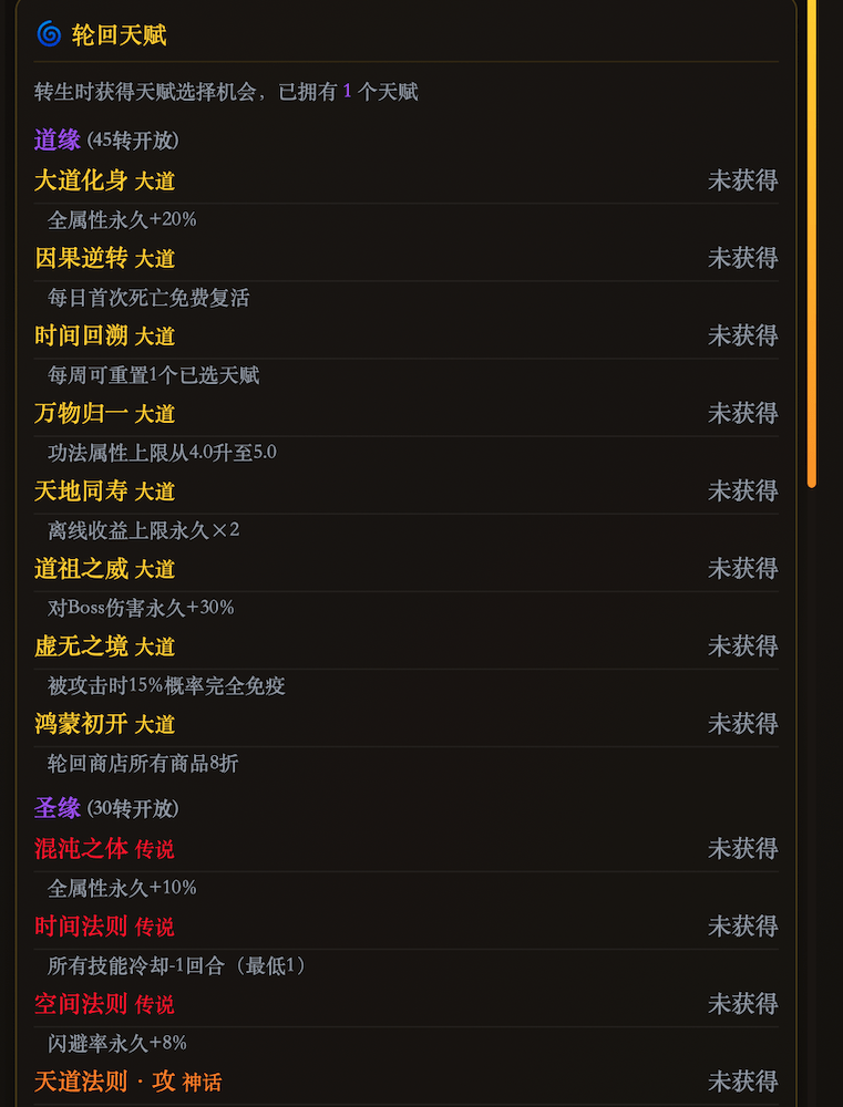 等级达到上限后击败转生Boss,开启下一世修行。每次转生永久提升攻防血蓝,并从44个天赋中随机抽取。天赋分4层品质,从凡缘到道缘层层递进——"灵气亲和"经验+8%、"剑意通明"攻击+8%+技能伤害+5%、"大道化身"全属性+20%……每次转生都是全新的策略组合。