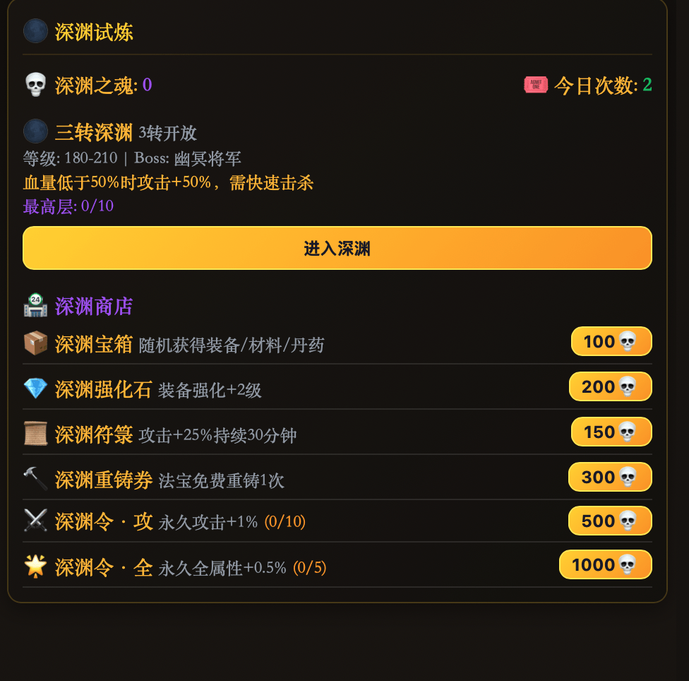 8大深渊副本,每深渊10层随机事件——普通战斗、双重挑战、精英遭遇、增益选择、神秘宝箱。50%概率触发命运模式,怪物更强但奖励翻倍。终极Boss各有独特机制:镜像复制你的属性、每回合吸血回复、三阶段变身属性翻倍、元素弱点每5回合轮转……