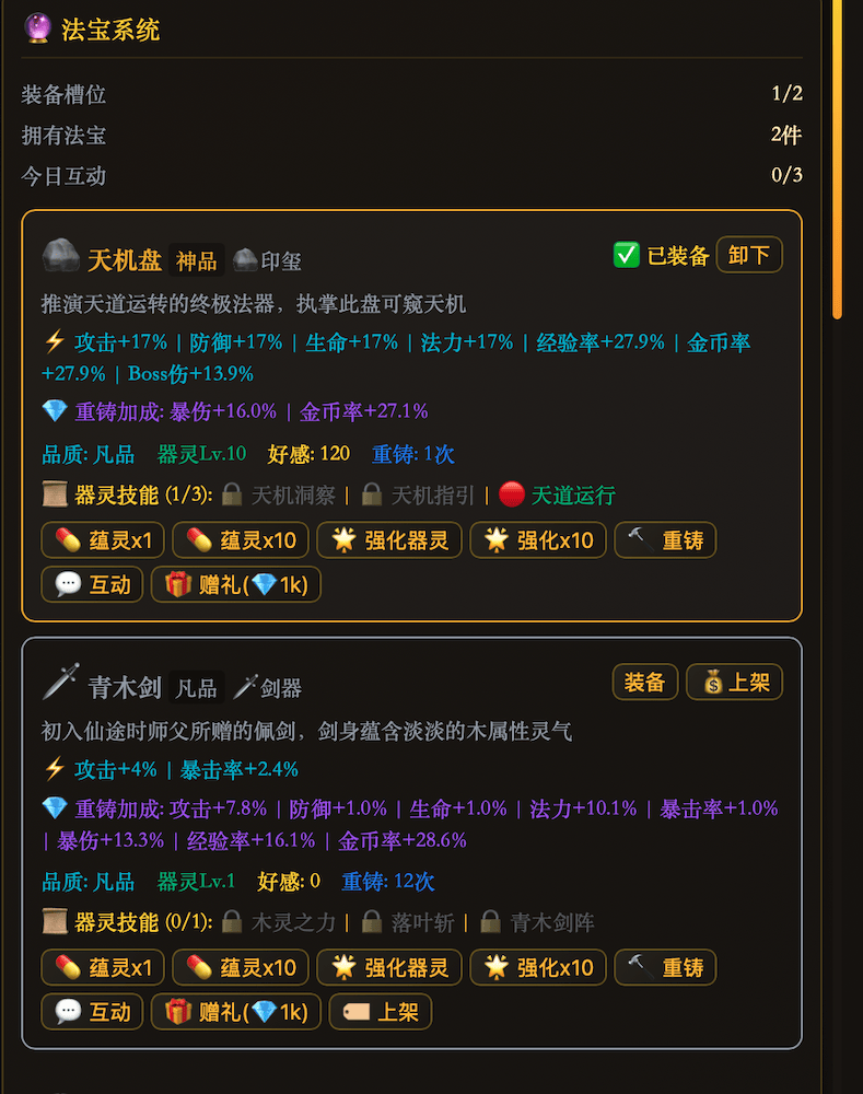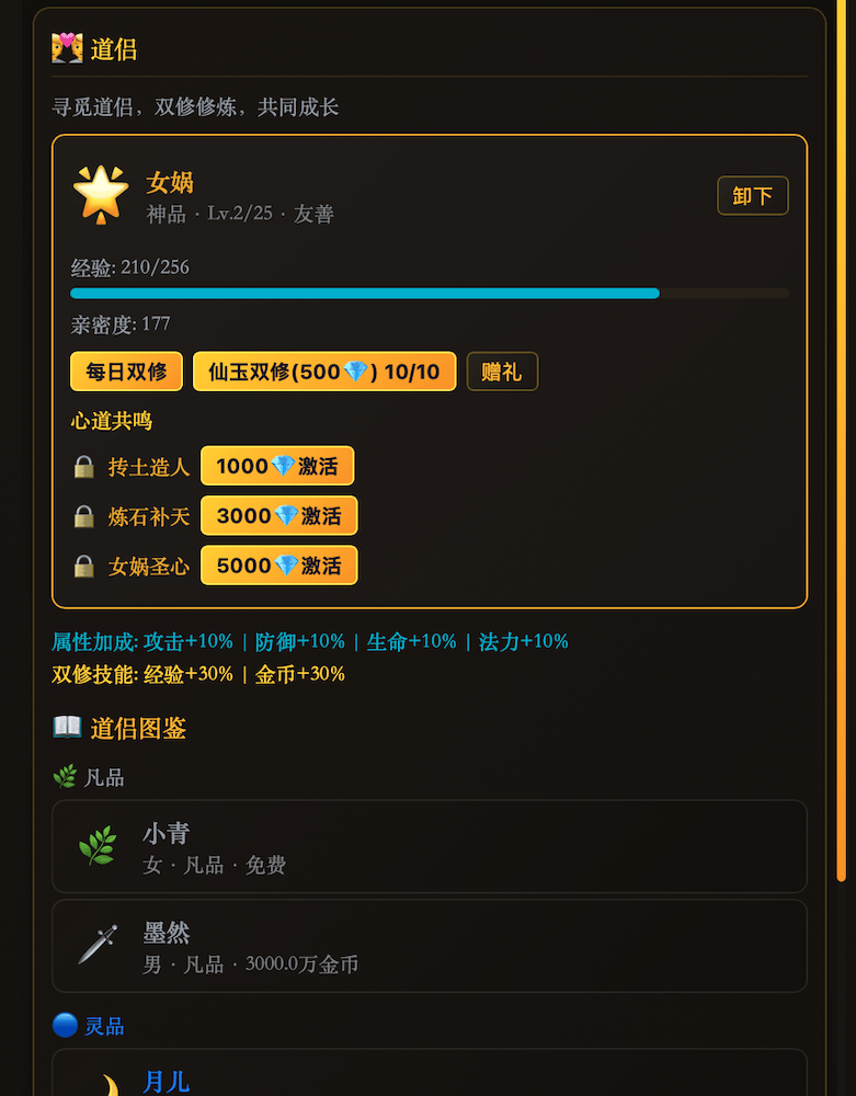 15件法宝养成,5种器灵品质,好感度满解锁终极技能。13位道侣NPC,从初识到道侣6级亲密度,31个仙缘事件随机触发,还有故事链连续剧情等你解锁。