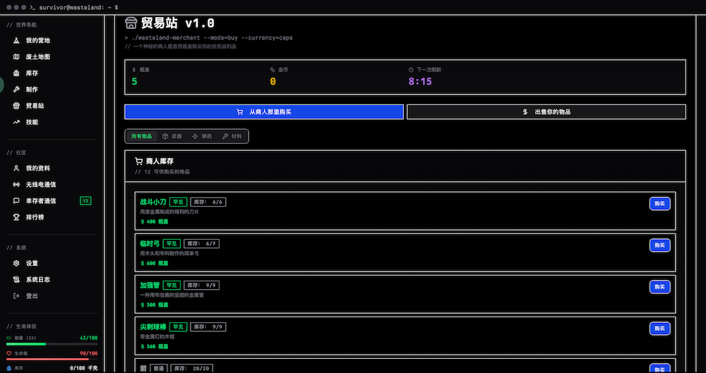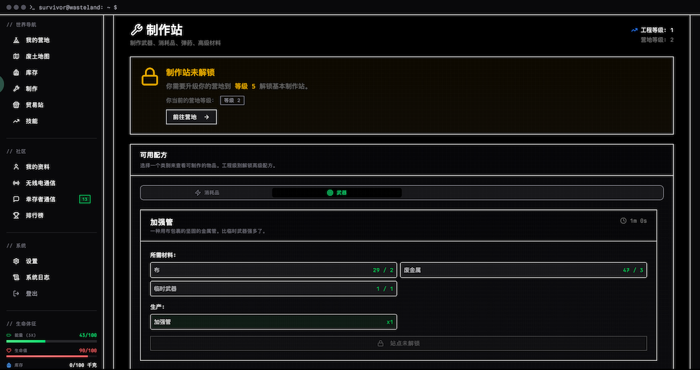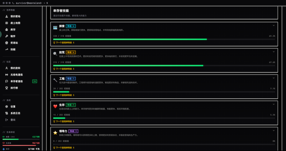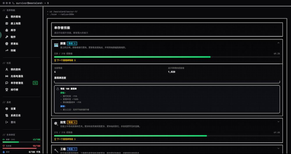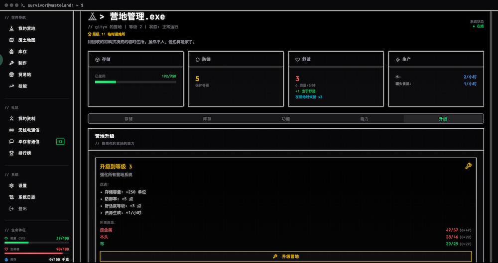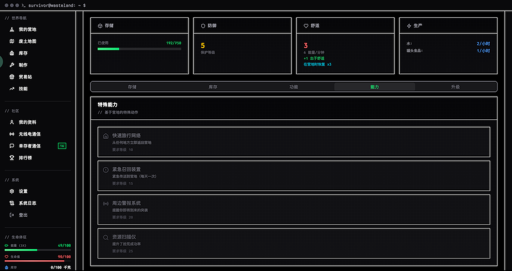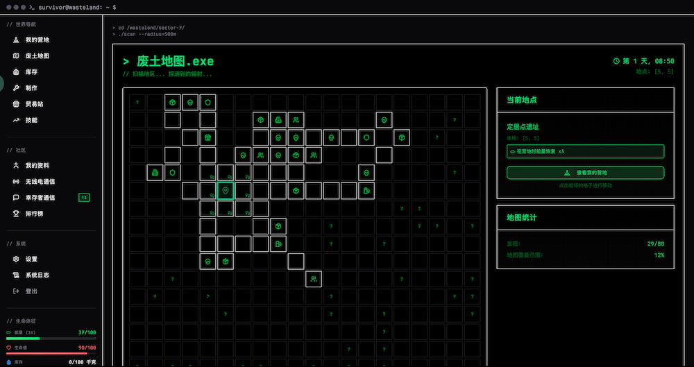 《文明末日MMO》,是一款类似《13层》的文字探索游戏,不同之处是融入了MMO元素,可以和其他玩家战斗。您的任务是通过搜寻和升级您的营地来在世界末日中生存下来!