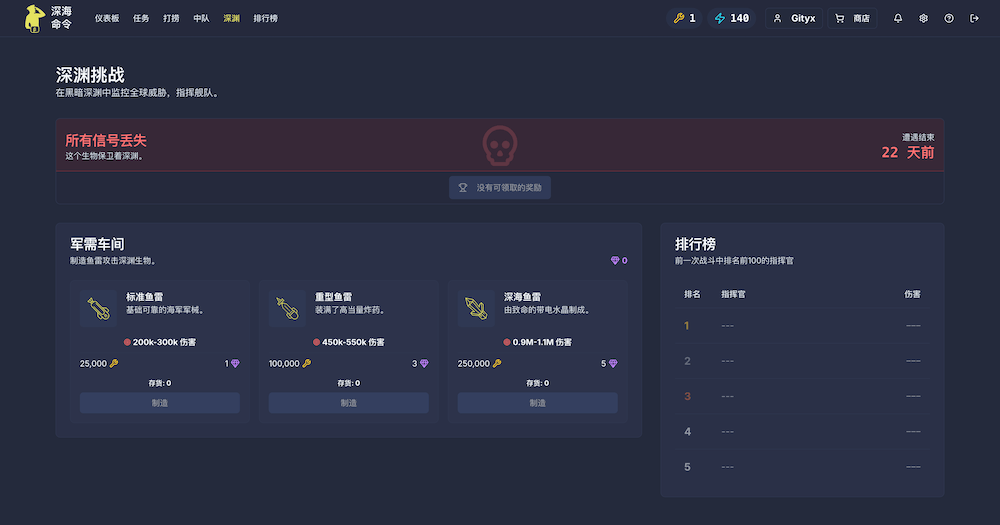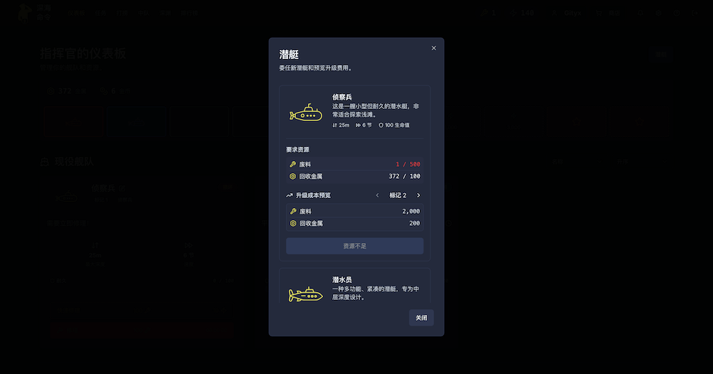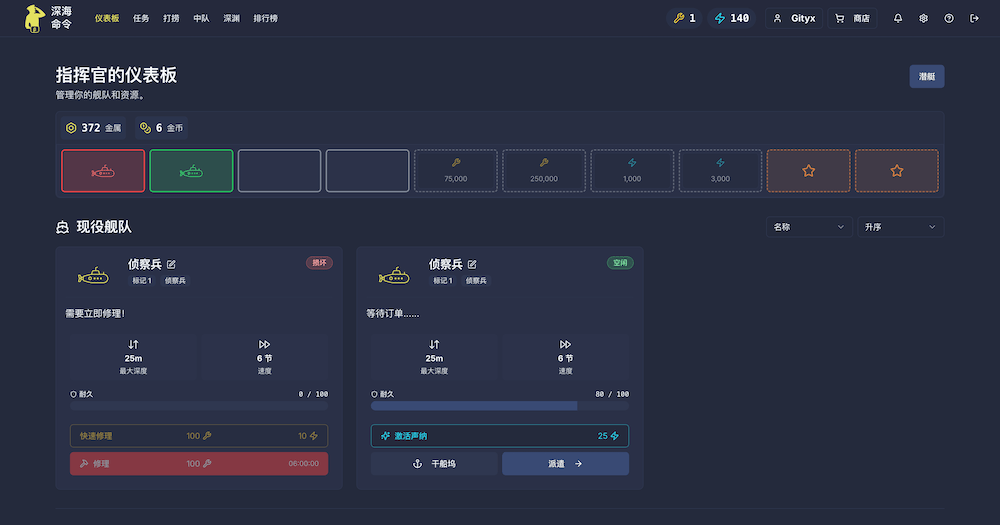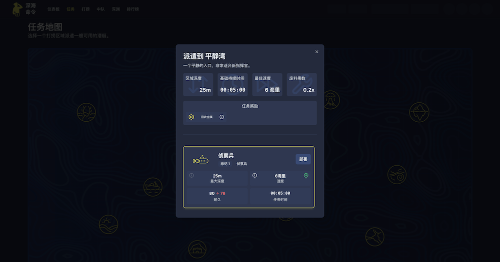 《深海命令》,是一款免费的增量式放置类浏览器/手机游戏。玩家可以在其中建造和升级一支潜艇舰队,然后派遣它们执行任务,自主搜寻资源,返回后即可领取资源。资源用于建造更强大的潜艇。