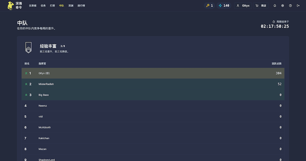 游戏包含晋升机制,每周活跃前三名晋升,后三名降级。